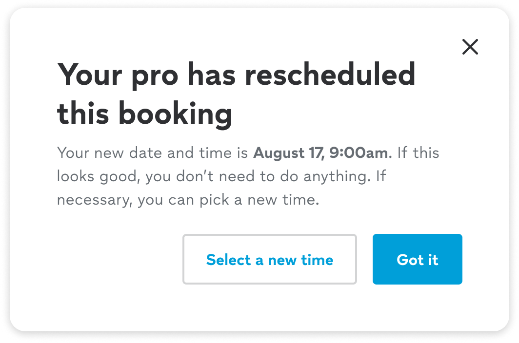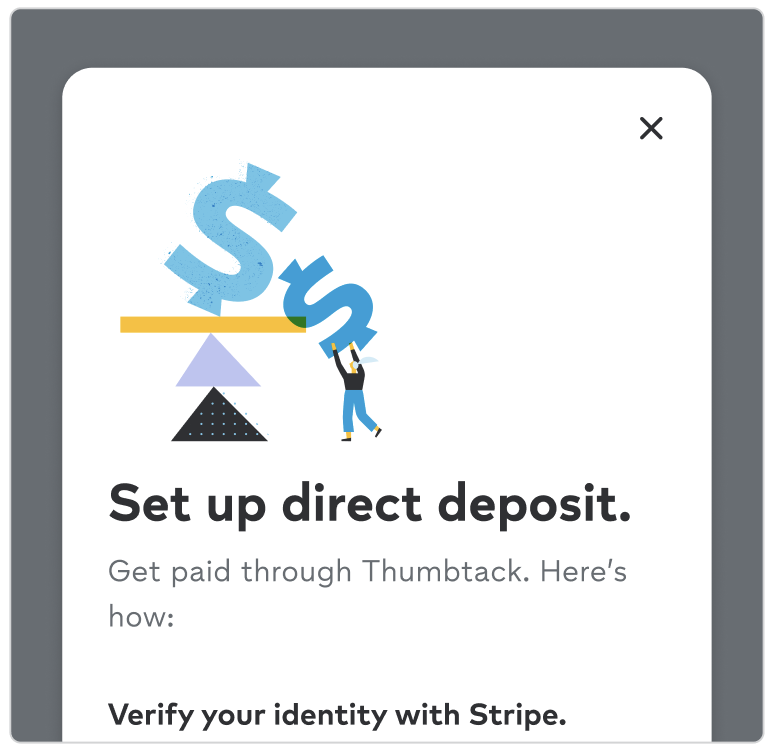 Modal dialogs appear as an overlay on a page. They should be used when Thumbtack requires a user response or needs to explain critical information without losing context of the page beneath it.