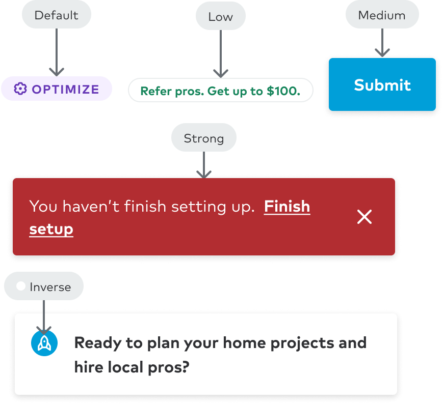 Not all experiences are treated equal. To provide varying levels of importance in conjunction with the hue, we use levels of emphasis to draw the users attention. A strong emphasis is high contrast in comparison to the surface the component occupies.