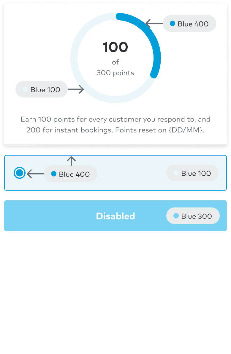 - Icon color primary on 100-level blue surfaces or paired with text of same color value