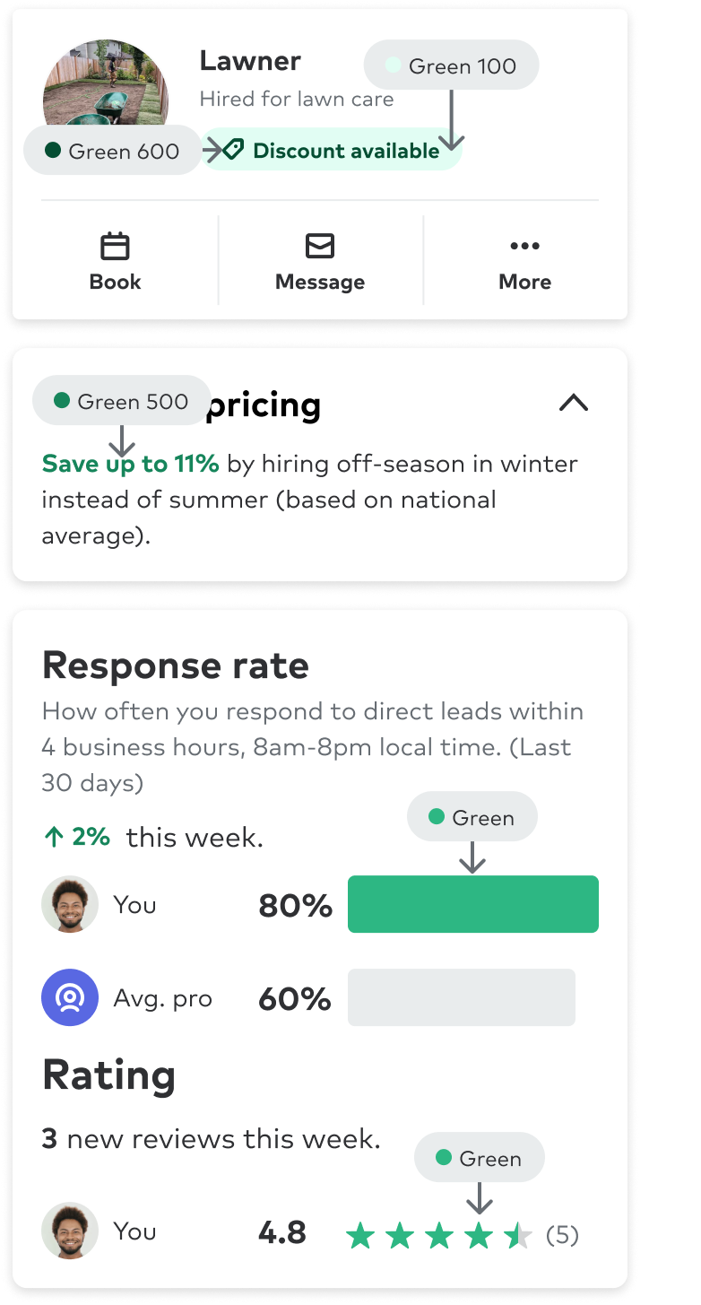 - Text color on default neutral surface success, completion, (ex: savings, discounts, revenue growth, etc) (bold text should be at least 18.5px and 24px for non-bold copy)