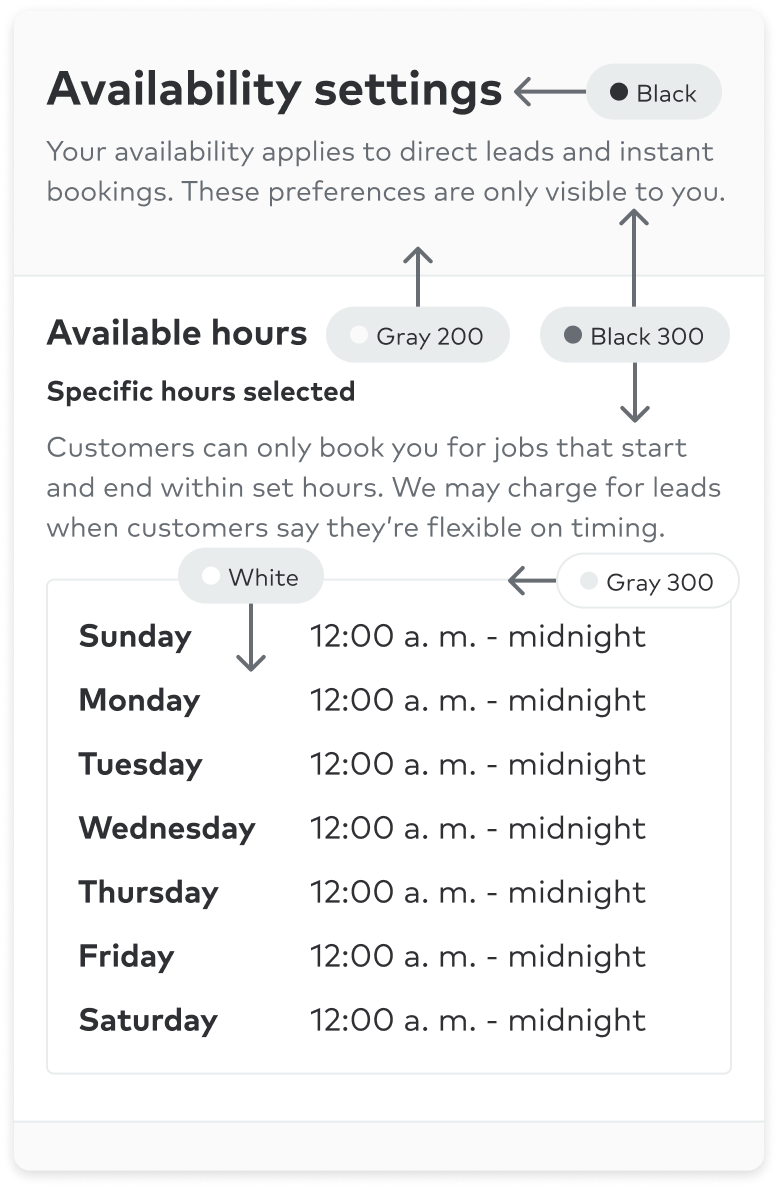 - Text color on default neutral surface (bold text should be at least 18.5px and 24px for non-bold copy)