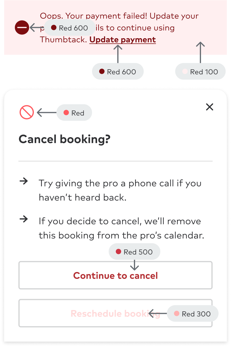 - Icon color alert on default neutral surfaces or paired with text of same color value (ex: revenue loss)