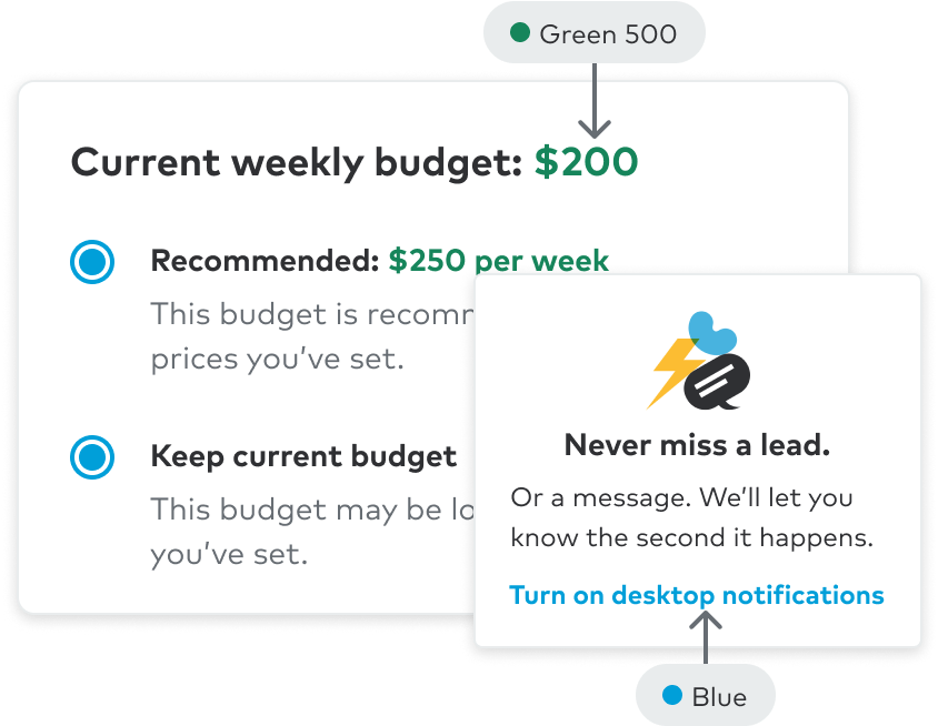Green 600 | strong | Text color on 100-level success surfaces success, completion, (ex: savings, discounts, revenue growth, etc) |